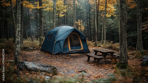 camping, tent, autumn, forest, wood, tree, leaf, fall, nature, campground, picnic, table, bench, wood, travel, adventure, wilderness, hiking, backpacking, recreation, relax, tranquil, scenic, landscape, environment, season, yellow, brown, green, dark, misty, foggy, ground, rock, branch, foliage, serenity, peace, calm, solitude, exploration, journey, get-away, escape, vacation