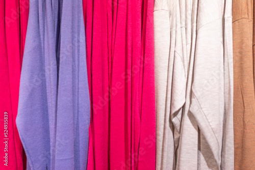 autumn collection of clothes in pastel colors in a store in a mall. High quality photo