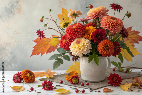 Autumn composition made of beautiful flowers on light backdrop. Floristic decoration. Natural floral background.