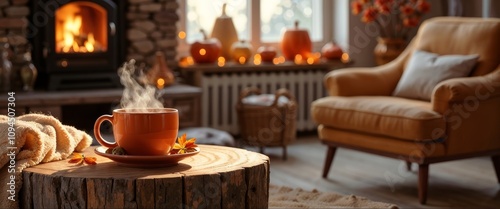 Autumn Cozy Living Room Self-Care Scene with Fireplace and Pumpkin Decor for Relaxation and Tranquility