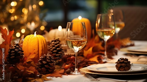 autumn, fall, table, leaf, illustration, decor, centrepiece, gourd, pine cone, clothes, gold, scattering, elegant, simple, rustic, charme, cosy, ambience, fairy, light, twinkle, setting, seasonal, harvest, thanksgiving, festive, arrangement, ornament, design, style