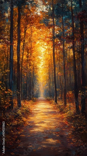 forest, path, tree, autumn, leaf, nature, landscape, painting, art, fall, colourful, gold, orange, brown, green, timberland, scenery, outdoors, season, wood, sun, light, bright, vibrant, beauty, calmness, peaceful, serene, majestic, breathtaking, inspiring, wanderlust, travel, adventure, serenity, rustic, wilderness, quiet, stillness, calm, mood, illustration, oil painting