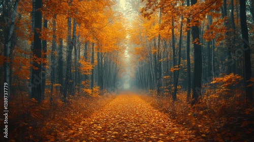 autumn, forest, path, tree, leaf, light, tunnel, orange, yellow, brown, green, blue, colours, nature, peaceful, tranquil, dreamy, evocative, calming, background, wallpaper, website, booklet, advertising, marketing, design, photo, image