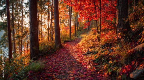 Autumn forest path surrounded by tall trees with sunlight and colorful leaves covering ground creating seasonal nature scenery symbolizing outdoor exploration travel and peaceful beauty