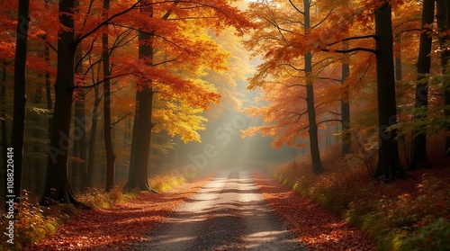 Autumn Forest Trail: "A scenic forest trail during autumn, lined with vibrant orange, red, and yellow leaves, with sunlight streaming through the trees; tranquil and atmospheric, crisp details."