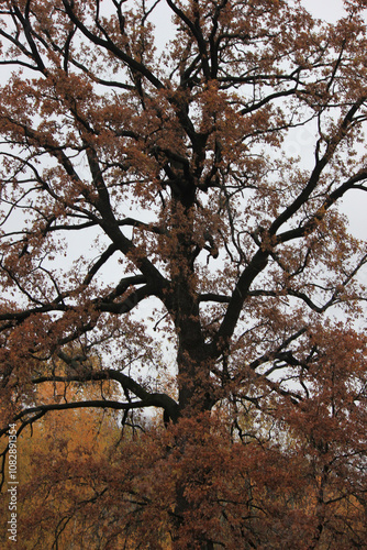 Autumn forest, trees with colorful leaves against sky, cloudy day