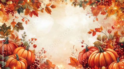 Autumn harvest display featuring pumpkins, berries, and vibrant foliage with warm bokeh lights illuminating the