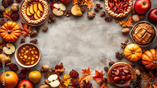 Autumn harvest display with pies, apples, pumpkins, and colorful leaves.
