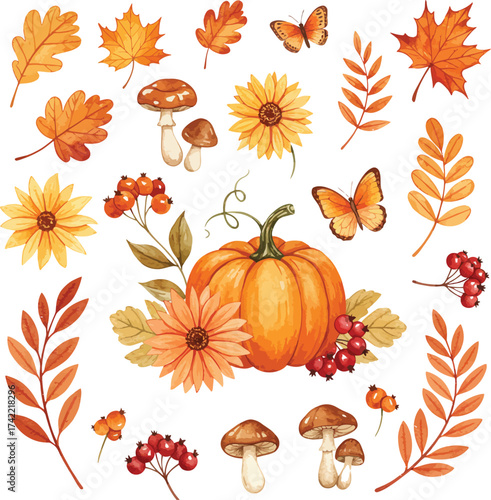 Autumn harvest elements pumpkin leaves flowers berries butterflies mushrooms