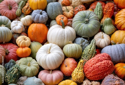 pumpkin, gourd, autumn, harvest, fall, vegetable, orange, white, green, colourful, variety, shape, size, nature, farm, field, garden, thanksgiving, halloween, decoration, vibrant, abundance, ripe, mature, round, oval, small, large, squash, winter, food, produce, agriculture, crop, plant, flora, botanical, natural, organic, healthy, delicious, sweet, savoury, texture, surface, pattern, design, background, still