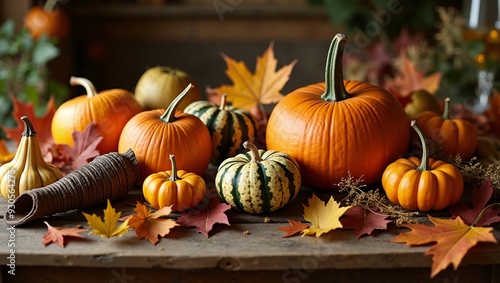 Autumn Harvest Pumpkins and Gourds with Fall Foliage