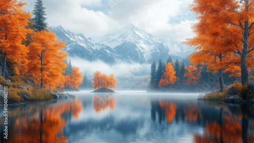 Autumn Lake has many trees growing on both sides of it. You can see the reflection in the water. Fog is floating around.