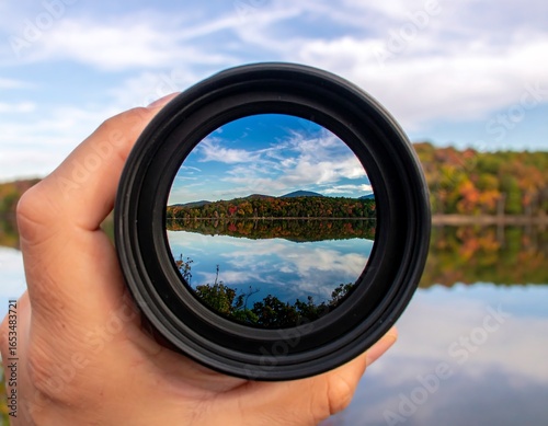 Autumn lake reflected in a camera lens