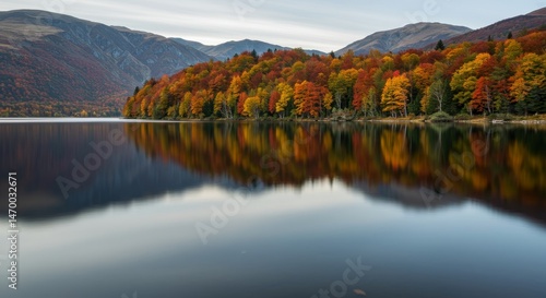 Autumn Lake Reflection - Serene autumn landscape featuring a calm lake reflecting vibrant fall foliage and mountains. Perfect for nature, travel, and seasonal themes