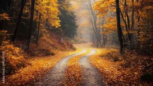 Autumn landscape in Eastern Europe: a magical forest road surrounded by vibrant yellow and orange leaves, tree trunks, and a picturesque fall scene