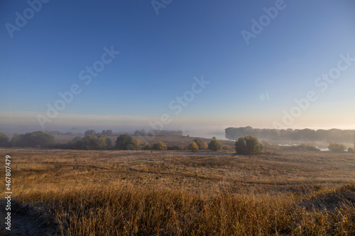 Autumn landscape in the early morning. Fog-covered expanses through which the first rays of the rising sun pass. Trees and hills in the fog. Dawn on a cold autumn morning.