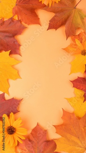 Autumn leaves arranged in a decorative frame with sunflowers, set against a warm backdrop