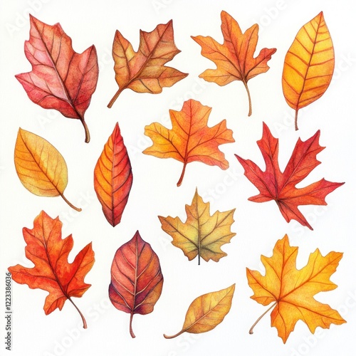 Autumn leaves collection, watercolor style, white background, fall design