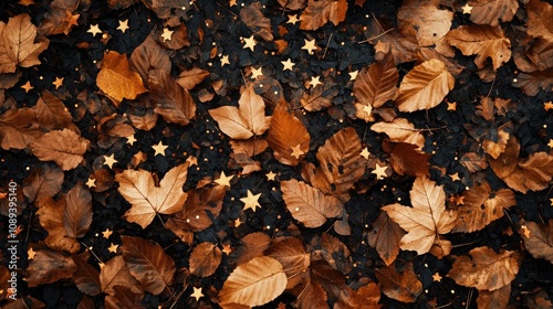 Autumn leaves, golden pumpkins, and scattered confetti stars create a vibrant seasonal background perfect for festive celebrations and seasonal decor.
