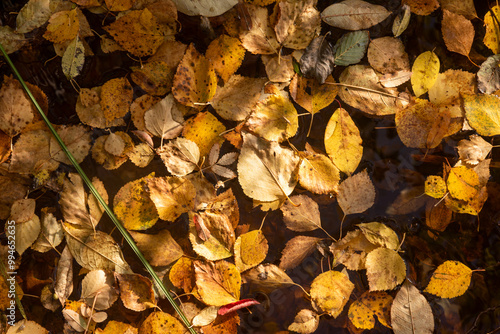 Autumn leaves in the water in the forest