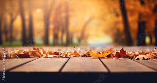 Autumn leaves on wooden boards, blur trees background