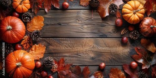 Autumn leaves, pumpkins, and pine cones arranged on rustic wooden background, perfect for seasonal or Thanksgiving-themed designs.
