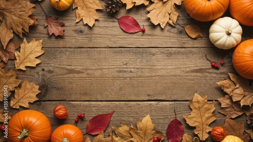 Autumn leaves, pumpkins, wooden background creating cozy seasonal atmosphere Celebrating harvest season