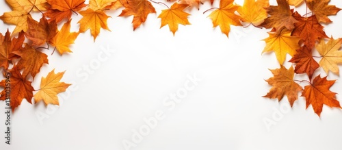 Autumn maple leaves in vibrant orange and yellow forming a frame on a clean white background with ample space for text in the center