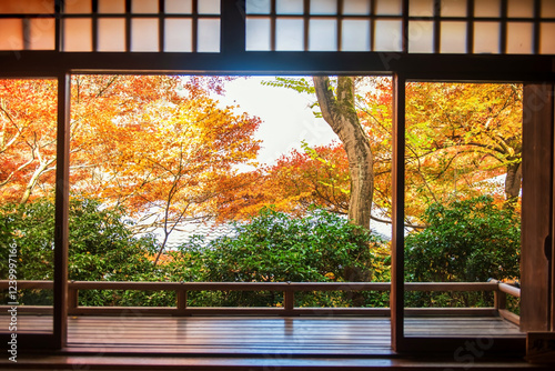 Autumn maple leaves view from Rurikoin Temple patio, Kyoto, Japan