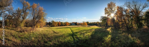 Autumn meadow, sunlit trees, rural landscape