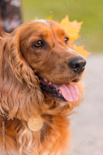 autumn mood. dog with leaves. gold and red color, walk in the park
