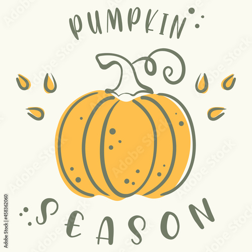 Autumn mood. Doodle pumpkin and seeds. Vector paint hand drawn picture in cartoon style. Greeting cards with lettering