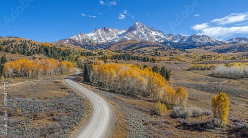 mountain, road, autumn, fall, colours, scenic, landscape, vale, tree, aspen, foliage, peak, nature, travel, hiking, view, adventure, drive, rural, path, winding, dirt, gravel, sun, sky, blue, white, cloud, snow, high, altitude, fall foliage, gold, yellow, orange, brown, grass, meadow, forest, pine, cottonwood, vista, explore, beauty, grand, picturesque, stunning, amazing