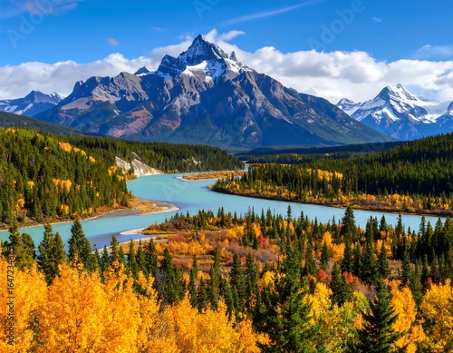 mountain, river, autumn, fall, colours, landscape, nature, scenic, peak, sky, cloud, forest, tree, gold, red, yellow, blue, water, wilderness, tranquil, autumn, high-coloured, majestic, panorama, canada, mountain, view, vale, fresh, beautiful
