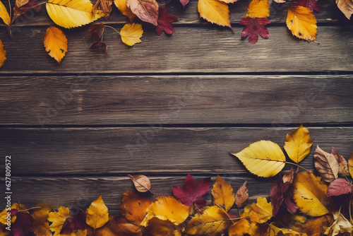 Autumn or fall leaves, top down view on wooden background. Generative AI