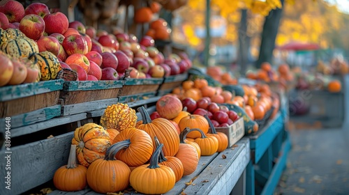 Autumn outdoor farm market with fruits and vegetables on the wooden shelves