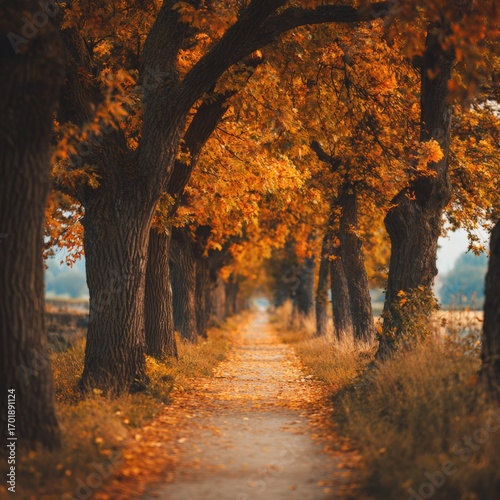 Autumn pathway lined with vibrant orange and yellow trees, creating a picturesque scene of nature's beauty and tranquility, inviting exploration and reflection