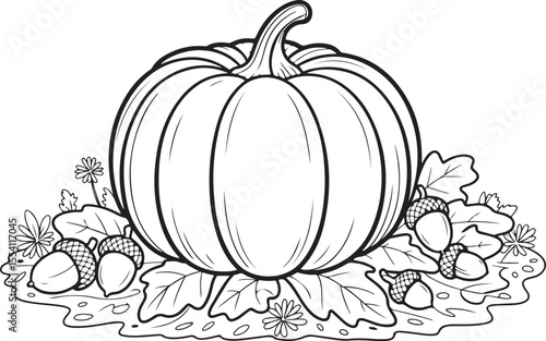 pumpkin, autumn, fall, harvest, leaf, acorn, nature, seasonal, thanksgiving, halloween, black-and-white, outline, squash, gourd