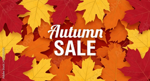 Autumn sale banner featuring red, orange, and yellow maple leaves arranged around white text, conveying seasonal discounts and the beauty of autumn foliage