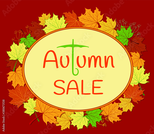 Autumn sale Lettering for discount purchase, Banner with colorful seasonal autumn leaves in circle on a white background. Vector illustration.