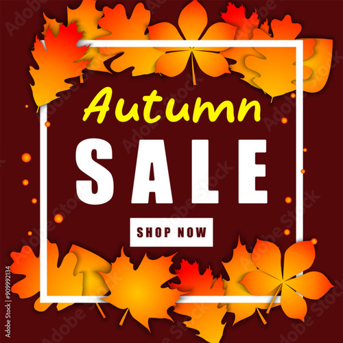 Autumn Sale poster or banner with autumn colorful leaves on dark brown background. Promotion for Autumn season. Vector illustration.