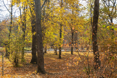 Autumn scene with a lot of yellow, red, orange leaves on a ground. Oak and maple leaves in the fall