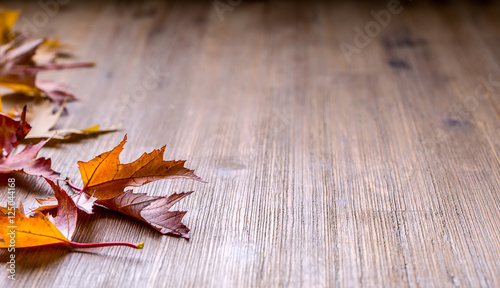 Autumn. Seasonal photo. Autumn leaves loose on a wooden board. Free space for your text products and informations.