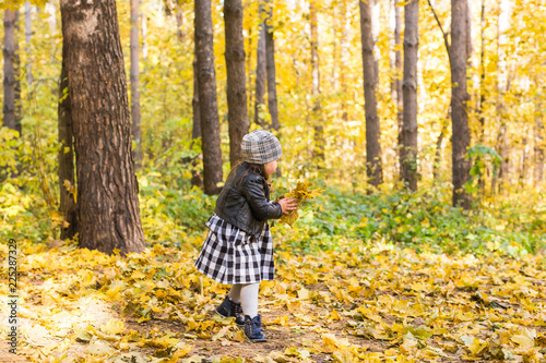 Autumn, seasons and children concept - happy little girl laughing and playing with fallen leaves in park