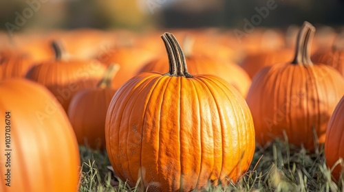 Autumn sunset illuminating a vibrant pumpkin patch, a soft golden light reflecting on the pumpkins, autumn sunset, nature s glow