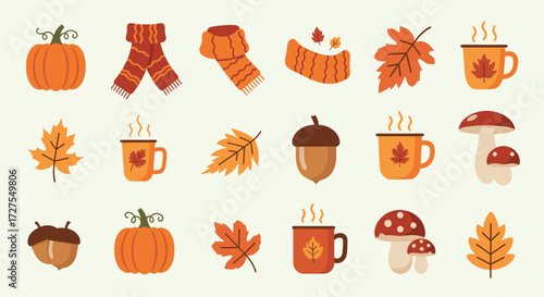 autumn, fall, pumpkin, leaf, foulard, mug, acorn, mushroom, seasonal, orange, brown, harvest, cosy, warm, beverage, drink, maple leaf, oak leaf, knitted, sweater, timberland, nature, foliage, thanksgiving, holiday, clip art, vector, illustration, design, graphic, element, art, decorative, cute, autumn, drawing, icon, symbol, pattern