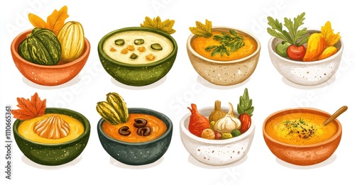 Autumn Vegetable Soups Set. AI generated illustration.