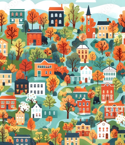 village, illustration, autumn, fall, colourful, house, tree, landscape, art, design, nature, green, orange, yellow, red, blue, cute, style, graphic, digital, vector, artwork, season, leaf, sky, drawing