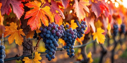 Autumn Vineyard Scene with Vibrant Red Orange Yellow Leaves and Clusters of Ripening Grapes in Warm Sunset Light Ideal for Winemaking Themes