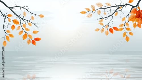 autumn, leaf, branch, water, orange, yellow, grey, nature, landscape, serenity, calm, peaceful, tranquil, misty, foggy, autumn, fall, season, scenery, background, watercolor, painting, art, illustration, image, graphic, design, minimalist, simple, elegant, subtile, soft, muted, colours, palette, texture, light, sky, horizon, still, quiet, atmosphere, mood, theme, october, november, september